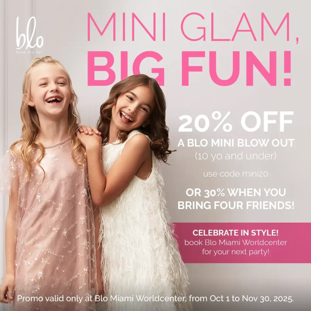 Book Blo Miami Worldcenter for your next kids’ party and celebrate in style with 20% off a Blo Mini Blow Out for ages 10 and under, or save 30% when you bring four friends!